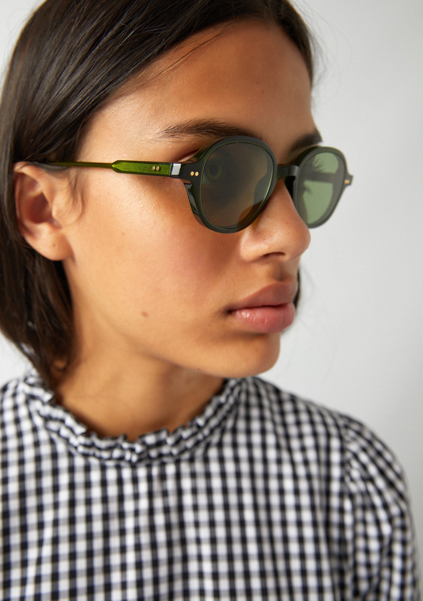 Acetate frame front in monochrome transparent dark green. Acetate arms. Flat green mirror lenses with 100% UV protection and anti-reflective treatment, set at the acetate level. Built-in acetate nose pads. Hand made.